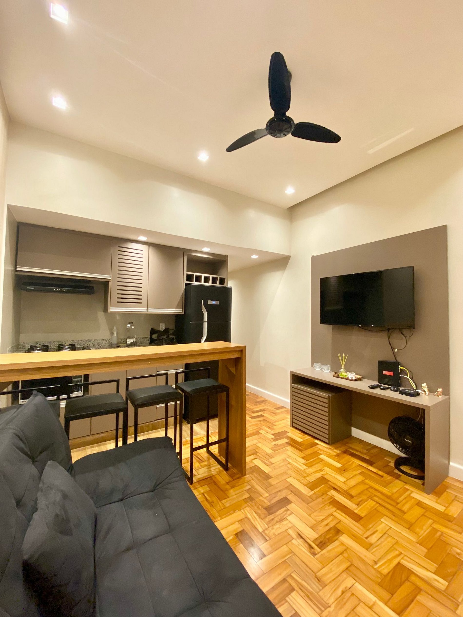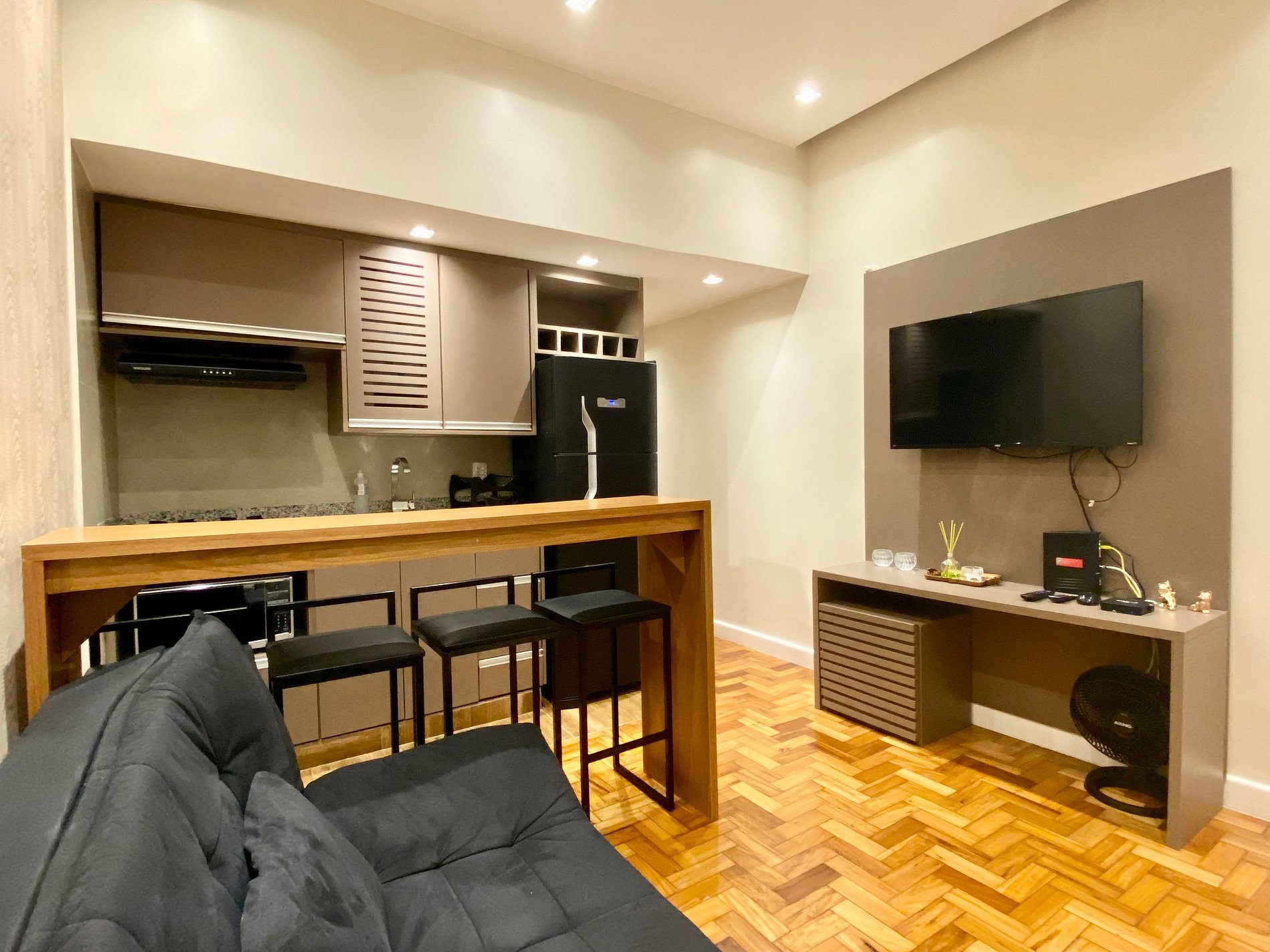 Studio renovado e dividido em área de quarto, sala, cozinha americana e banheiro. Localizado em rua residencial tranquila e com muito comércio e serviços próximo.